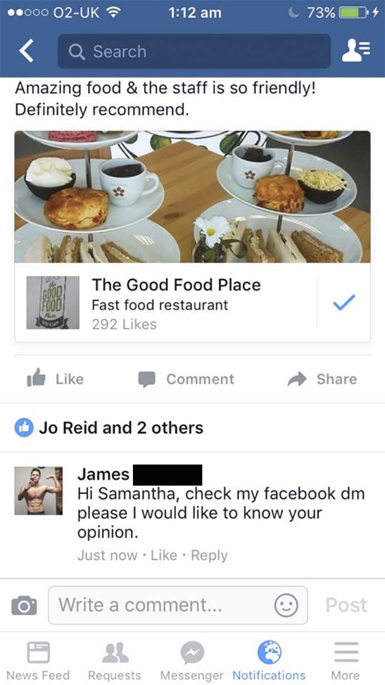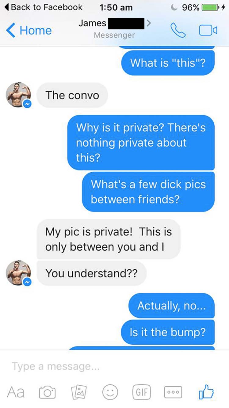 „Last night I received a comment on a review I left for a lovely little restaurant. When I checked my messages, *BOOM* Unsolicited dick pic! I’ve read about these mystical happenings but since I’ve been in a loving, pre-Tinder, three-year relationship, I never thought I’d witness the horror first hand.
